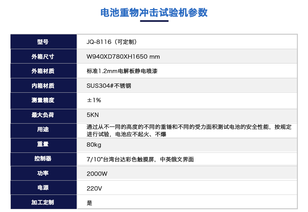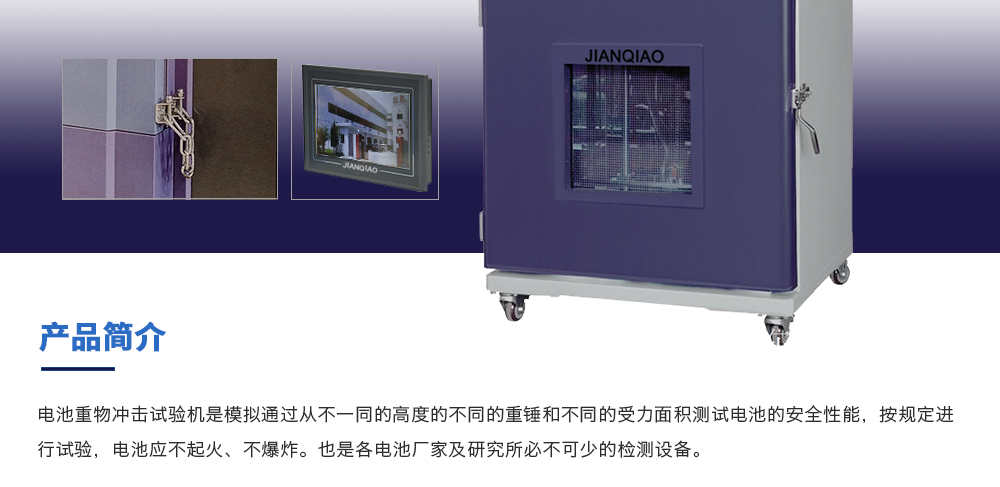 用途:電池重物沖擊試驗機是模擬通過從不一同的高度的不同的重錘和不同的受力面積測試電池的安全性能,按規(guī)定進行試驗,電池應不起火、不爆炸。也是各電池廠家及研究所必不可少的檢