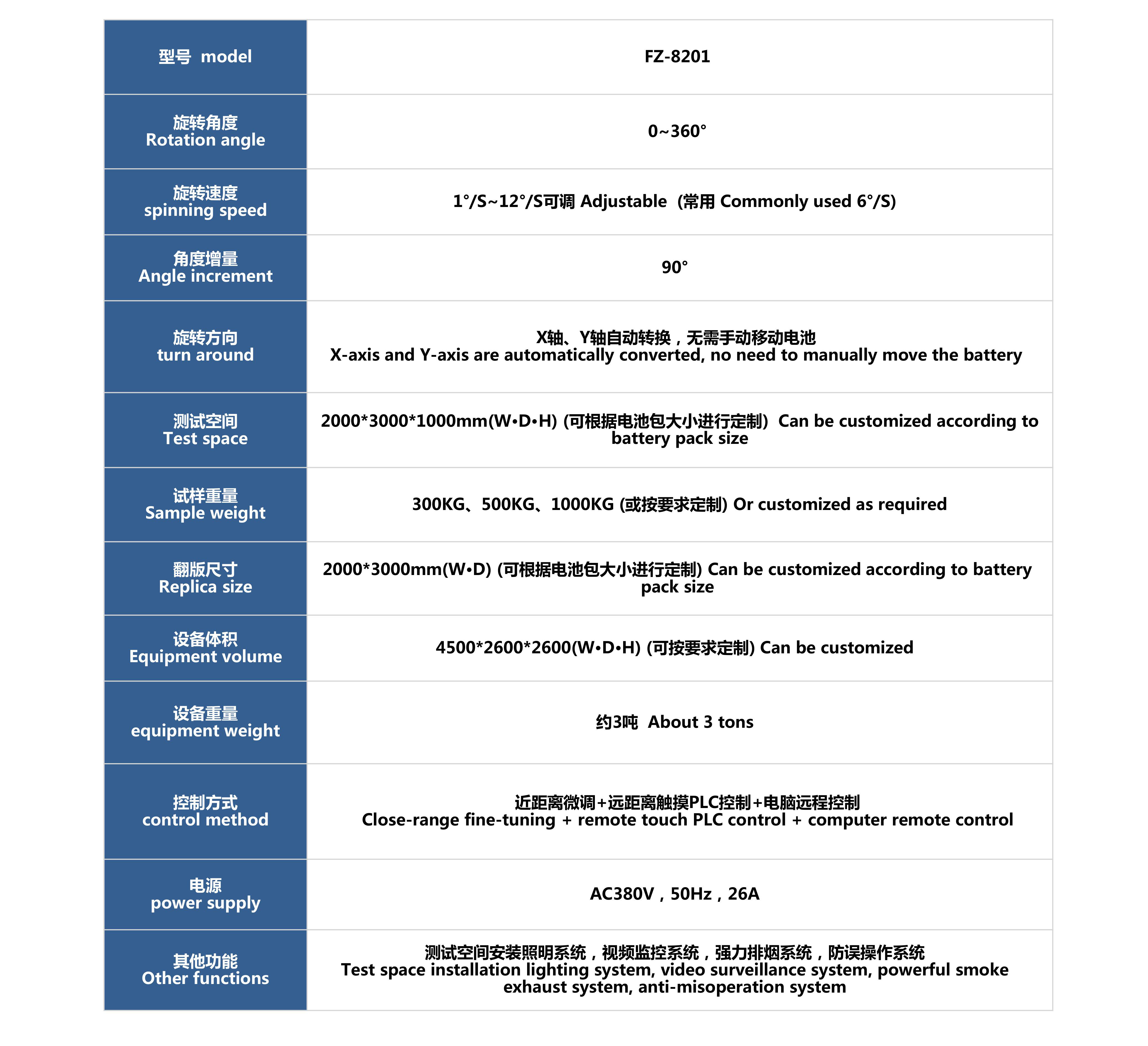 用途:電池包翻轉試驗臺是模擬電池包或系統安裝在電動汽車上,汽車在行駛過程中出現高角度上坡、下坡、側翻、翻轉等特殊情況下,觀察電池包或系統可能會出現的不同狀況。在試驗室中