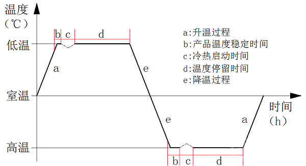 熱循環(huán)試驗(yàn)是一種利用高低溫交變濕熱試驗(yàn)箱對(duì)試驗(yàn)產(chǎn)品進(jìn)行的預(yù)設(shè)高低溫交替的應(yīng)力考核,用以驗(yàn)證材料和產(chǎn)品是否達(dá)到在研發(fā)、設(shè)計(jì)、制造中預(yù)期的質(zhì)量目標(biāo)的一類可靠性試驗(yàn)。通過大溫變速率可暴露產(chǎn)品潛在的材料與性能缺陷,經(jīng)過不斷地質(zhì)量改進(jìn),達(dá)到可靠性提升的目的。航天單機(jī)類產(chǎn)品一次熱循環(huán)示意圖見下圖1所示。
