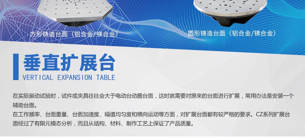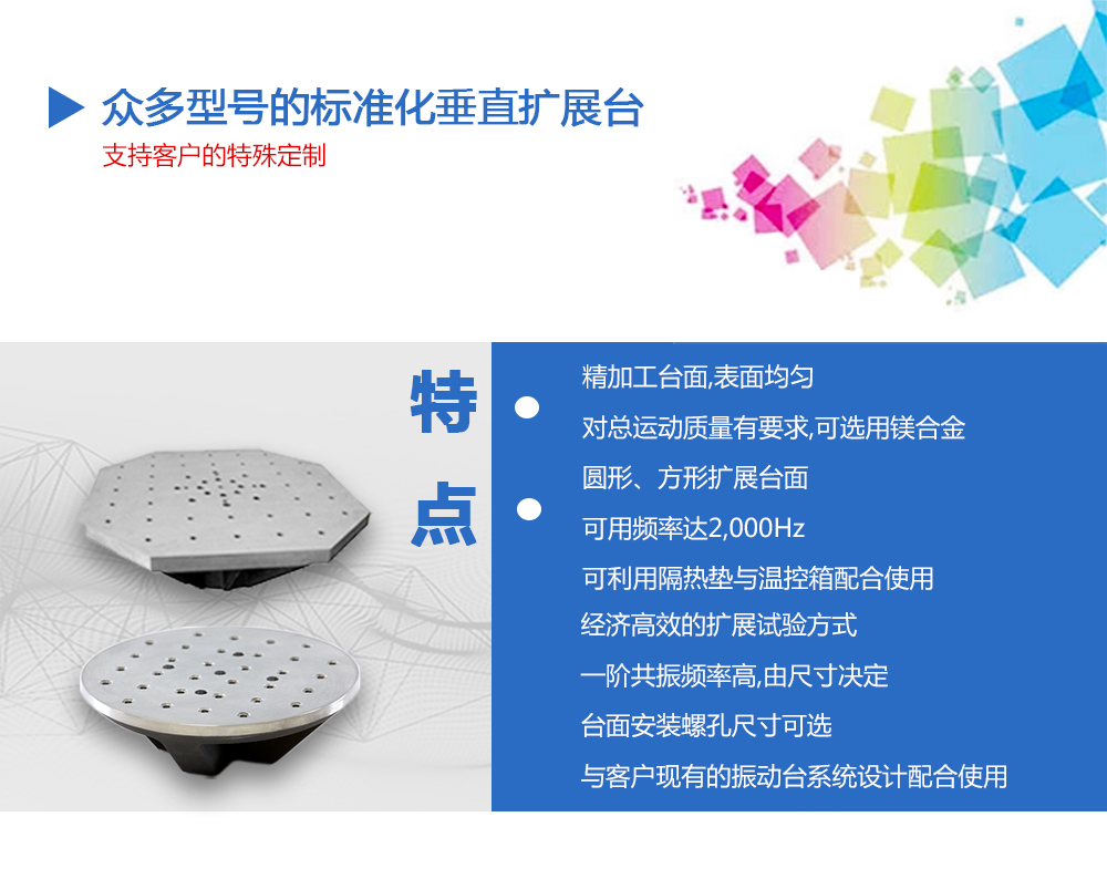 用途:供應眾多型號的標準化垂直水平擴展臺,而且支持客戶的特殊定制,從而滿足客戶對振動臺性能擴展的需求。在實際振動試驗時,試件或夾具往往會大于電動臺動圈臺面,這時就需要對